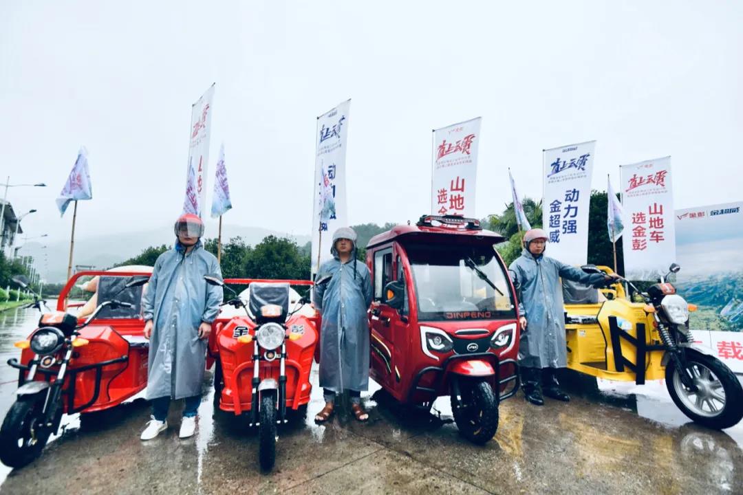 出發(fā)儀式現(xiàn)場,7位騎手全副武裝,7輛滿載不同重量的金彭電三輪整裝待發(fā),最大載重2046斤。雖然現(xiàn)場小雨瀝瀝,但是仍然阻擋不了在場每一位見證者的熱情